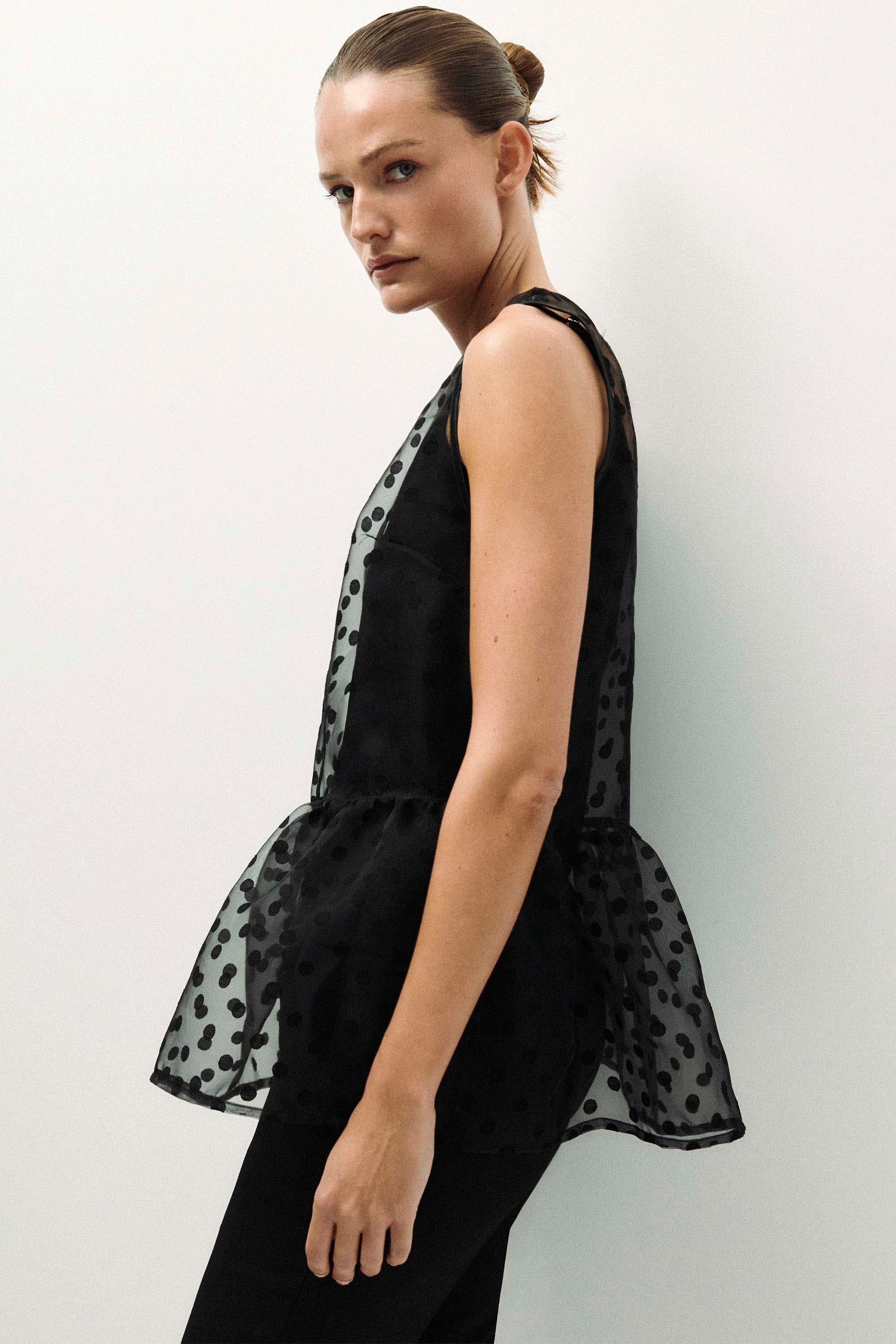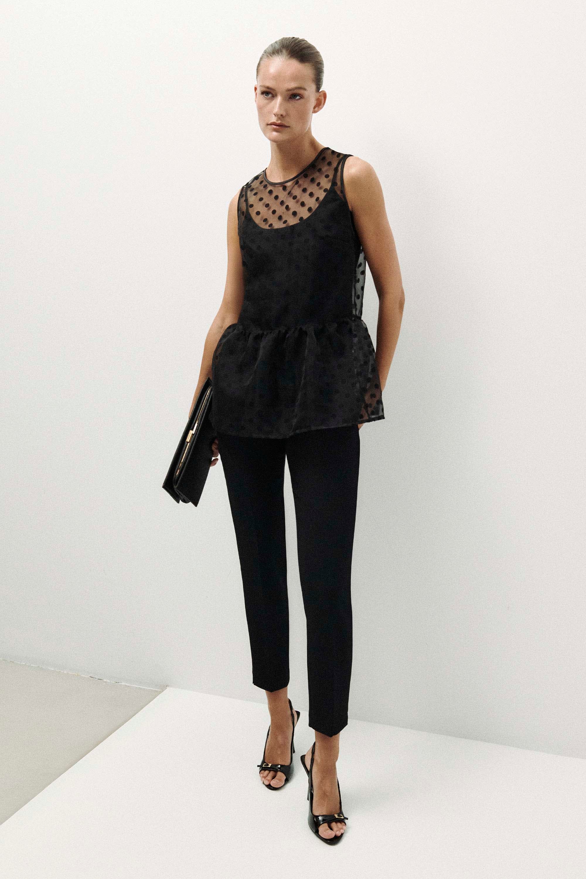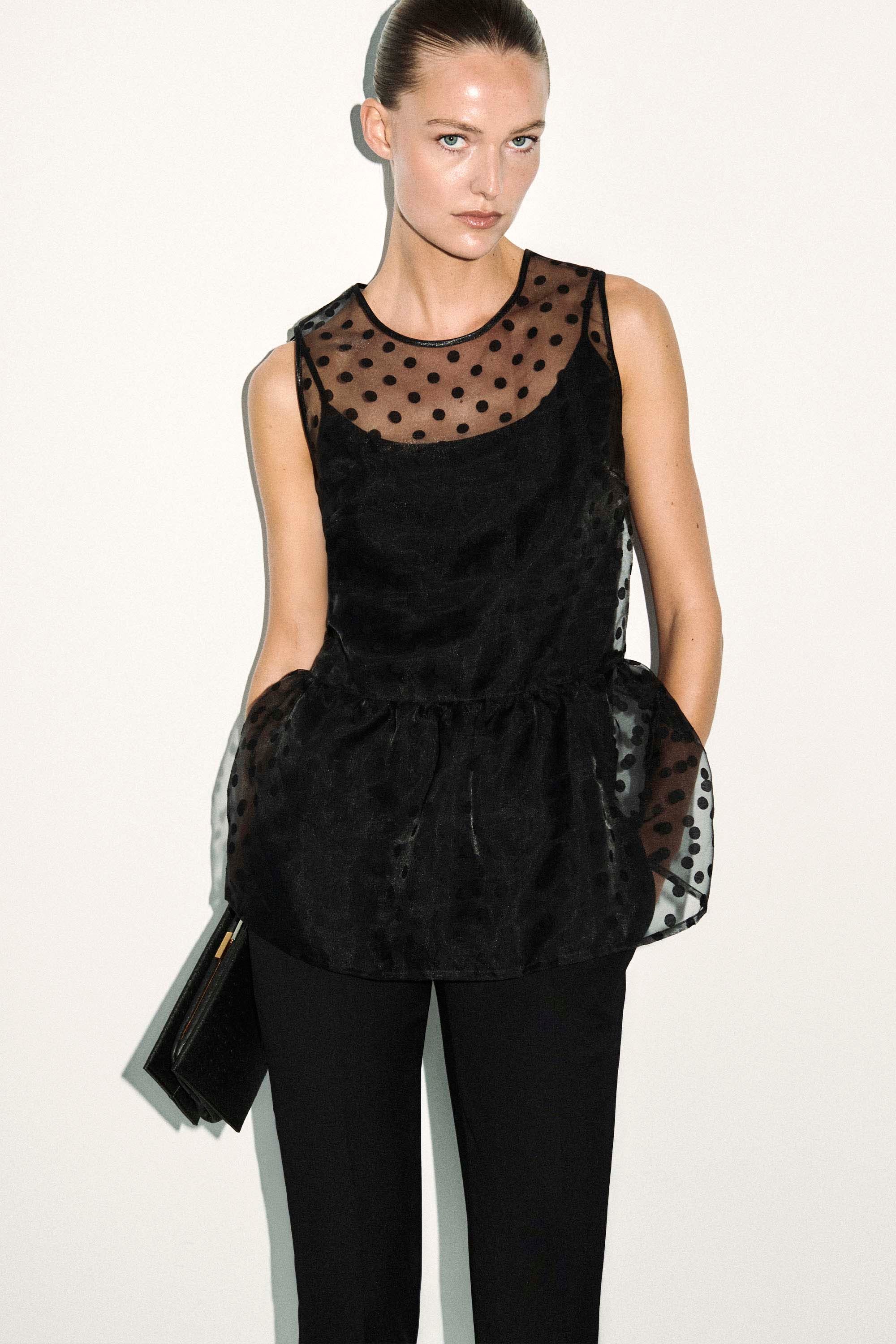 Bluzka z transparentnej organzy w grochy to modna i elegancka propozycja dla kobiet, które lubią efektowne, ale lekkie stylizacje. Wykonana z półprzezroczystej tkaniny, pięknie układa się na sylwetce i dodaje stylizacjom zmysłowej delikatności. Ta ponadczasowa bluzka bez rękawów świetnie sprawdzi się zarówno latem, jak i w połączeniu z marynarką lub żakietem. Jej największym atutem jest modny wzór grochów, który idealnie wpisuje się w aktualne trendy oraz dół wykończony baskinką, która podkreśla talię i tworzy kobiecą, elegancką linię. W komplecie znajduje się bawełniany top z dzianiny, który zapewnia komfort i pozwala nosić bluzkę bez obaw o prześwity. Bluzka ma wszyte w boki subtelne tasiemki, którymi można podkreślić talię i dopasować fason do sylwetki wiążąc je w tyle. Na wieczór zestaw jbluzkę z eleganckimi spodniami INESSA lub wygodnymi dzwonami COPPER lub CAROLYN.Wygodne szpilki i minimalistyczna biżuteria stworzą doskonałą stylizację na Sylwestra, święta lub rodzinne uroczystości.