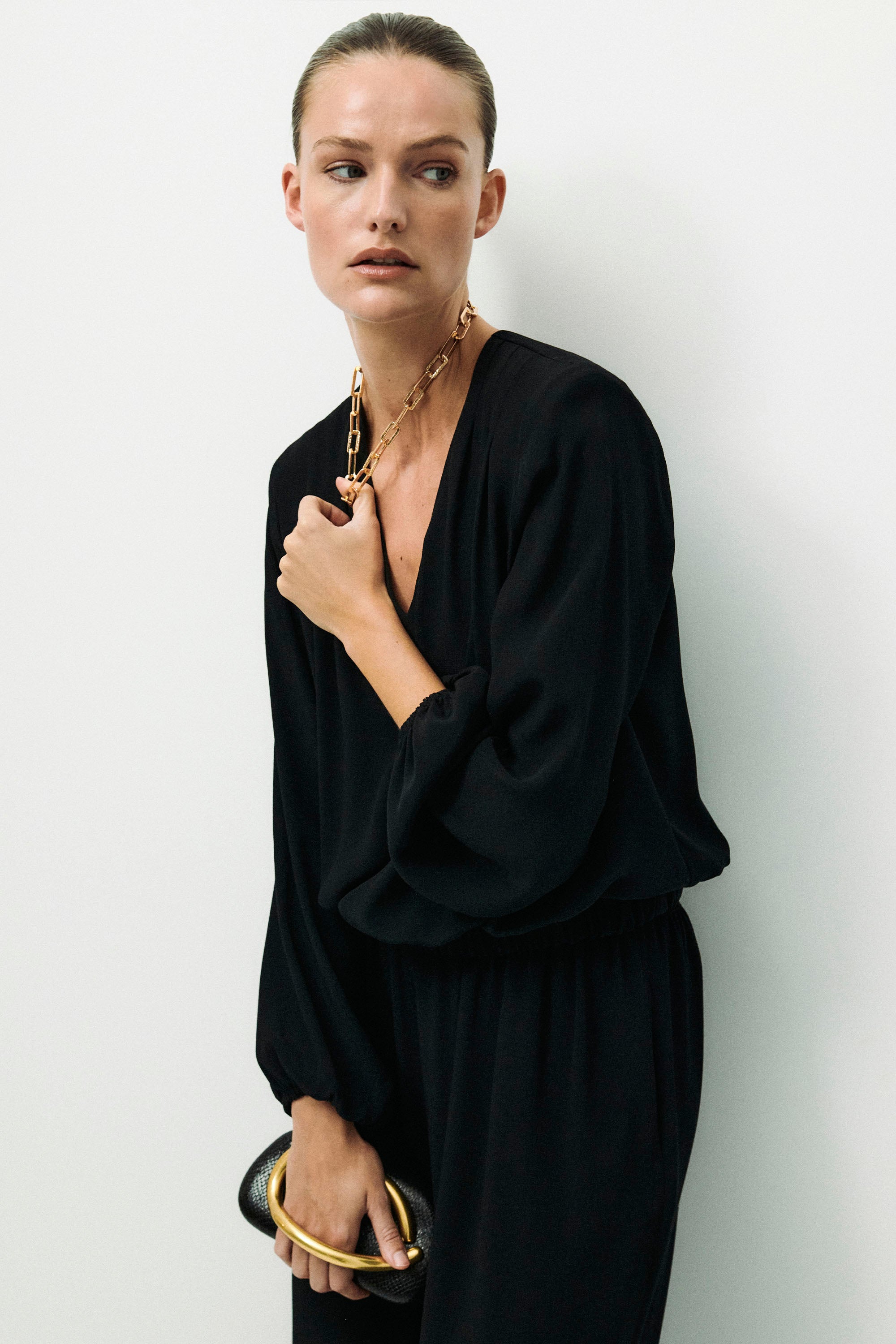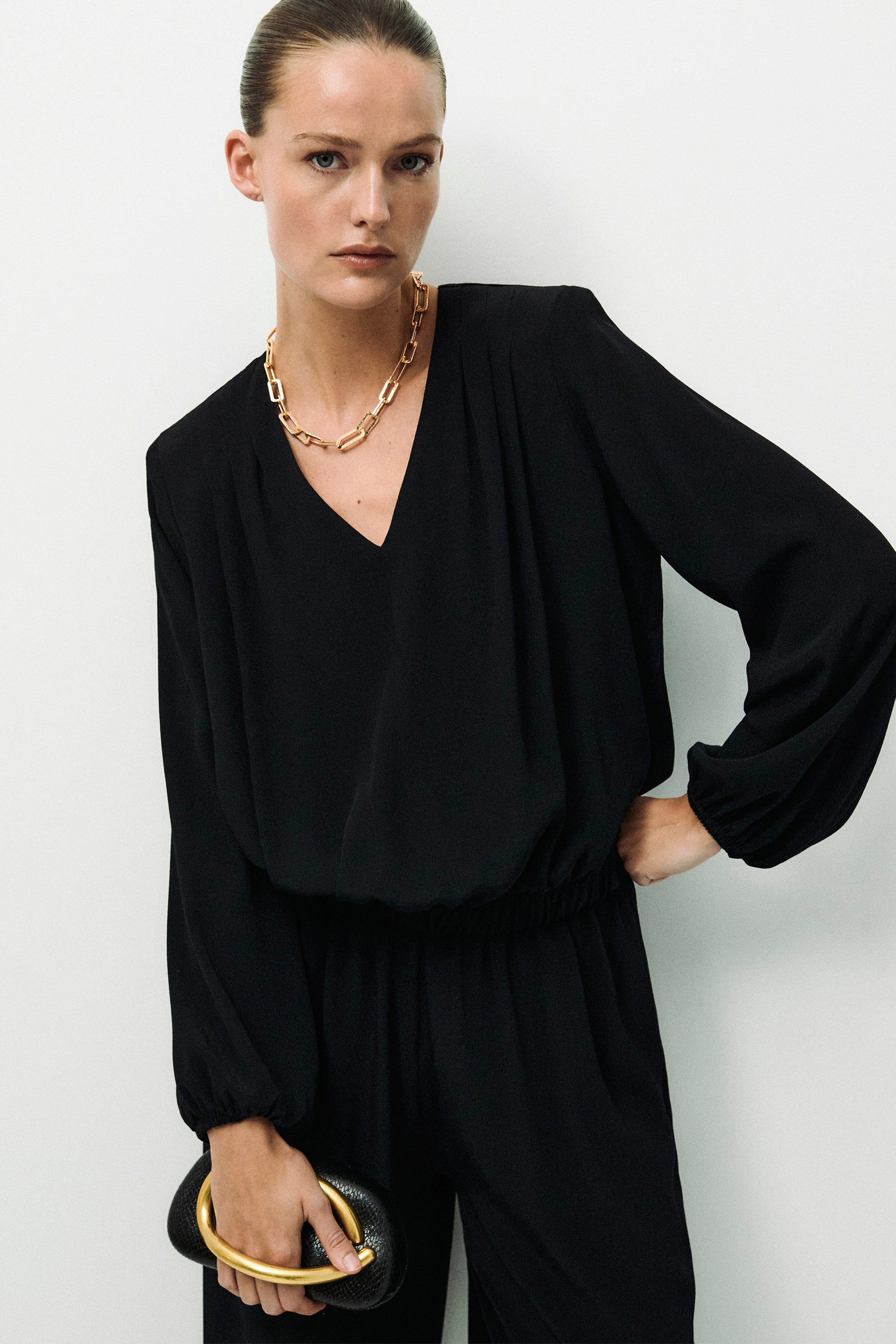 Wiskozowa bluzka AMBRE z dekoltem w szpic to stylowy balans między kobiecością a nowoczesną formą. Dół bluzki i rękawy zakończone są gumką, dodają więc lekkości sylwetce i zapewniają idealne dopasowanie. Dekolt wysmukla szyję i optycznie wydłuża sylwetkę, małe zakładki na biuście idealnie podkreślają kobiece kształty, a subtelne poduszki pięknie podkreślają linię ramion, nadając proporcje. W dziennych stylizacjach zestaw ją z eleganckimi spodniami COPPER z wysokim stanem lub cygaretkami INESSA, uzyskasz wtedy idealną stylizację do biura. Na specjalne okazje połącz ją ze spodniami TILIA uszytymi z tej samej tkaniny i stwórz niezapomniany, a przy tym bardzo wygodny i uniwersalny zestaw. Całość uzupełnij wyrazistą biżuterią i butami, aby nadać szyk swojje stylizacji.
