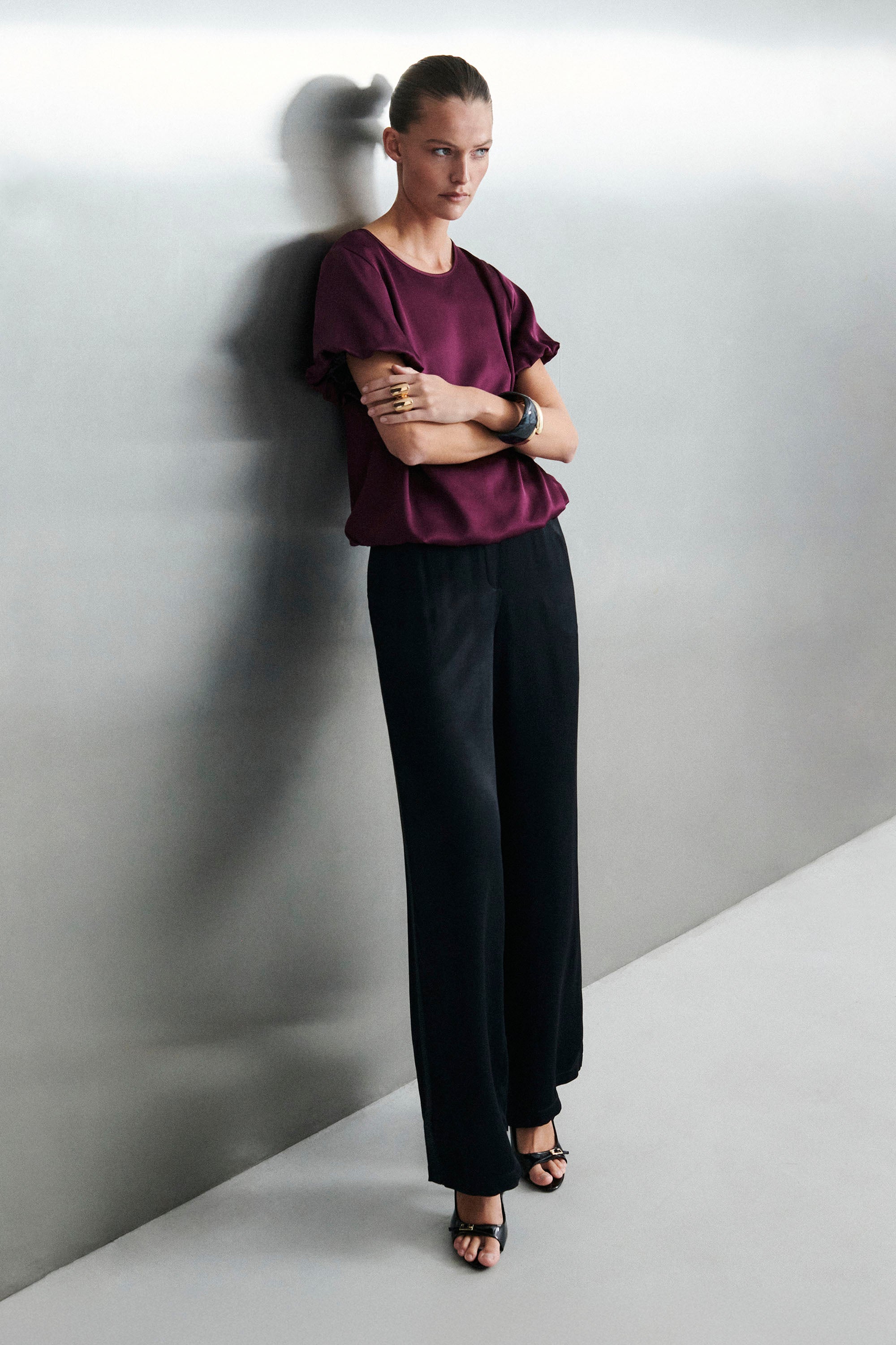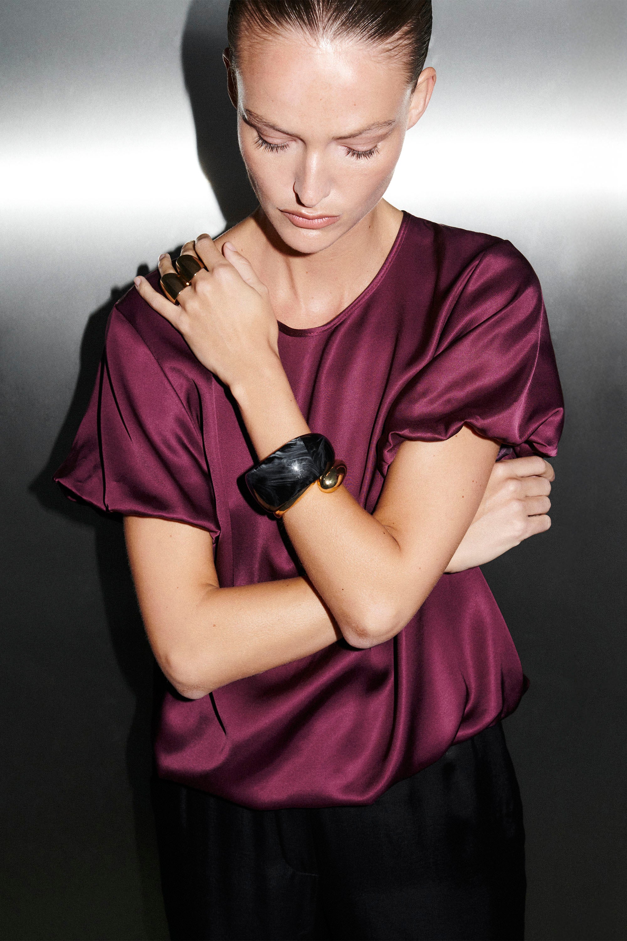 Bluzka z satyny w pięknym odcieniu bordo to kwintesencja współczesnej elegancji. Klasyczny dekolt pod szyję, subtelny połysk tkaniny i marszczone rękawy tworzą luksusowy efekt, a wykończenie dołu gumką zapewnia komfort i wygodę. Na eleganckie spotkanie zestaw ją ze spodniami COPPER typu dzwony lub ołówkową spódnicą ALANIS. Na spotkanie przy kawie połącz ją z jeansami i szpilkami, by uzyskać efekt eleganckiego casualu. W duecie ze spodniami z eko-skóry RENNE i kozakami stworzy modny, wieczorowy zestaw z pazurem. Na większe wyjście załóż do niej spodnie ESPIN A z ozdobnym lampasem, stylowe sandałki i minimalistyczną biżuterię.