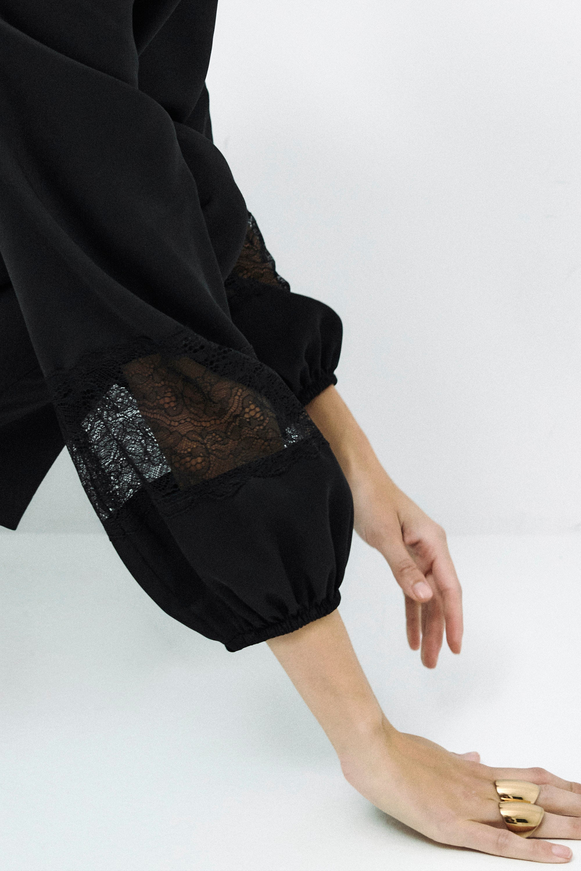 Elegancka bluzka z czarnej satyny wiskozowej to wyjątkowy model, który łączy klasyczną prostotę z subtelną kobiecością. Uszyta z delikatnie połyskującej tkaniny z wstawką z koronki pięknie układa się na sylwetce, nadając stylizacji lekkości i szyku. Prosty fason zapewnia wygodę i swobodę ruchów, a wszyta u dołu gumka pozwala delikatnie bluzować materiał, podkreślając linię talii. Rękawy również zakończone są gumką, co tworzy subtelny efekt bufki. Ozdobna koronka dodaje bluzce romantycznego i wyrafinowanego charakteru. Dekolt pod szyję podkreśla minimalizm i elegancję modelu, jednocześnie sprawiając, że bluzka idealnie sprawdzi się zarówno na co dzień, jak i na specjalne okazje. Okrągły dekolt jest też idealnym tłem dla krótkich naszyjników. Na Sylwestra lub święta połącz bluzkę ze spodniami dzwon COPPER lub cygaretkami INESSA. Dodaj szpilki i biżuterię w złotym odcieniu i stwórz stylizację idealną na każdą uroczystość.