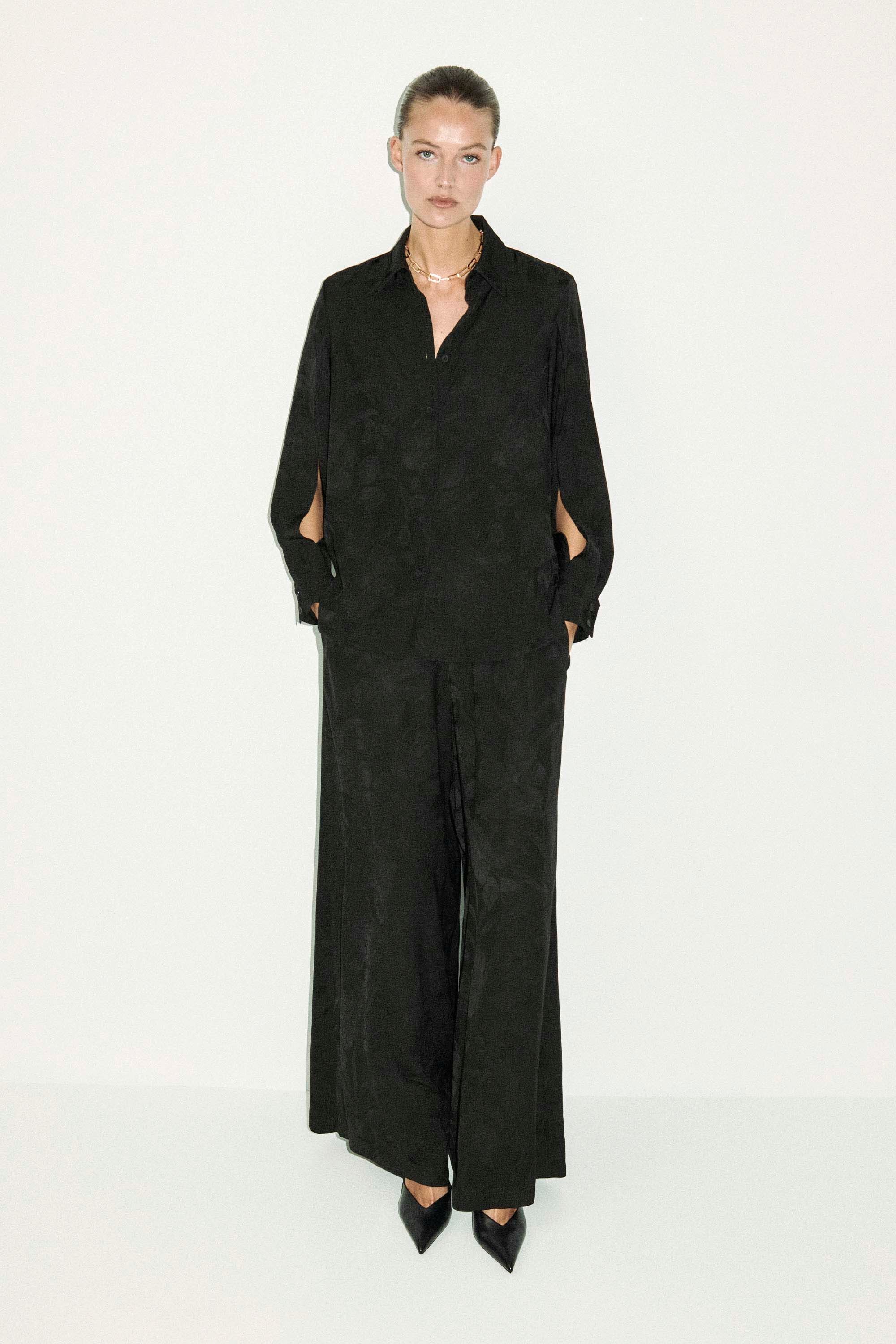 Koszula CHLOE uszyta jest z lejącej wiskozy żakardowej z subtelnym połyskiem i elegancką fakturą w duże kwiaty. Lekka, miękko układająca się tkanina pięknie podkreśla sylwetkę. Noszona ze spodniami VANILLI A wykonanymi z tej samej tkaniny tworzy efektowny komplet przypominający elegancki i wyjątkowo szykowny kombinezon. To idealny wybór dla kobiet, które cenią minimalistyczne formy, ale chcą postawić na mocny, modowy akcent. Koszula CHLOE wyróżnia także pęknięcie na rękawie, które dodaje stylizacji lekkości i współczesnego charakteru. Świetnie sprawdza się w wielu zestawieniach – zarówno codziennych, jak i wieczorowych. Na co dzień połącz koszulę z spodniami typu dzwony COPPER lub eleganckimi cygaretkami INESSA. Podkreśl talię paskiem, a całość dopełnij mokasynami i delikatną biżuterią. To idealny look do pracy, na spotkanie lub wyjście do miasta. Na wieczór stwórz wyjatkowy total look ze spodnaimi VANINI A lub z dopasowaną spódnicą ALANIS czy elegancką spódnicą z tafty VIRGINIE. Dodaj buty na obcasie oraz metaliczną kopertówkę. Będzie to idealny wybór na kolację, przyjęcie czy święta.