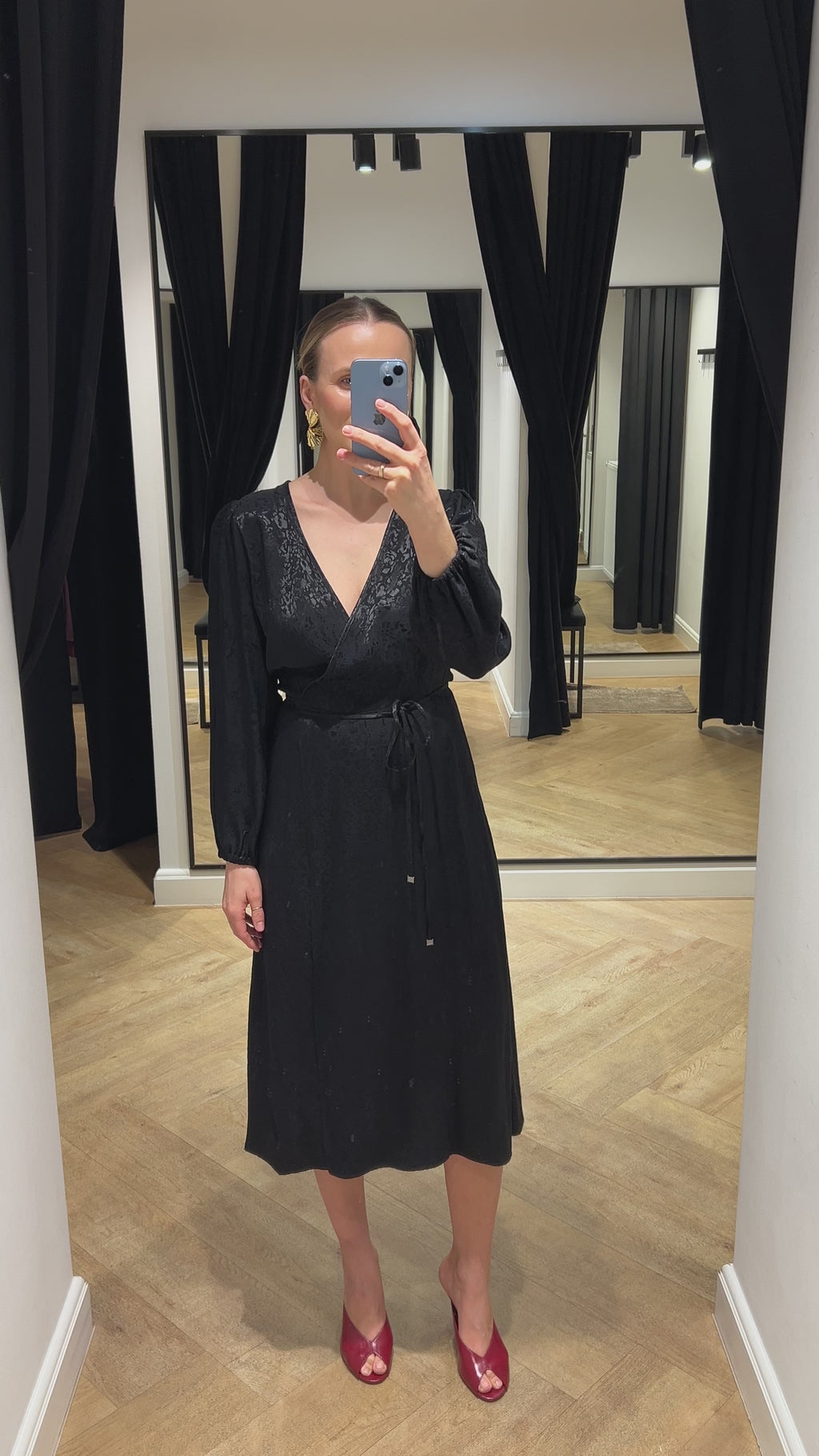Kopertowa sukienka SANNA uszyta z żakardowej wiskozy to wyjątkowy element garderoby, który łączy w sobie elegancję, komfort oraz ponadczasowy styl. Wykonana z wysokiej jakości tkaniny, ma delikatną, lejącą strukturę, która subtelnie dopasowuje się do sylwetki, podkreślając kobiece atuty. Jej oryginalny wzór w ecru na czarnym tle nadaje sukience wyjątkowego charakteru i sprawia, że jest idealna na różnorodne okazje – od codziennych spotkań po wieczorne wyjścia. Dzięki kopertowemu fasonowi, sukienka pięknie eksponuje talię, a regulacja dopasowania pozwala na uzyskanie idealnego efektu, niezależnie od sylwetki. Dekolt w szpic pięknie eksponuje szyję, optycznie wyszczuplając i wysmuklając sylwetkę. Marszczone rękawy zakończone gumką dodają całości subtelności i klasy, a rozkloszowany dół sukienki zapewnia swobodę ruchów, co czyni ją wygodnym wyborem na długie godziny noszenia. Zalety tej sukienki to nie tylko jej estetyka, ale także uniwersalność. Można ją łączyć zarówno z eleganckimi szpilkami, jak i z wysokimi kozakami, tworząc różnorodne stylizacje. Idealnie sprawdzi się na romantycznej kolacji, w pracy czy podczas weekendowego wyjścia z przyjaciółmi. Ponadczasowy wzór oraz klasyczny krój sprawiają, że ta niezwykle kobieca sukienka z wiskozy to inwestycja na lata – nigdy nie wyjdzie z mody, zawsze będzie na czasie. Warto mieć ją w swojej szafie, ponieważ z łatwością można ją wdrożyć w różnorodne stylizacje, podkreślając tym samym elegancję i kobiecość.