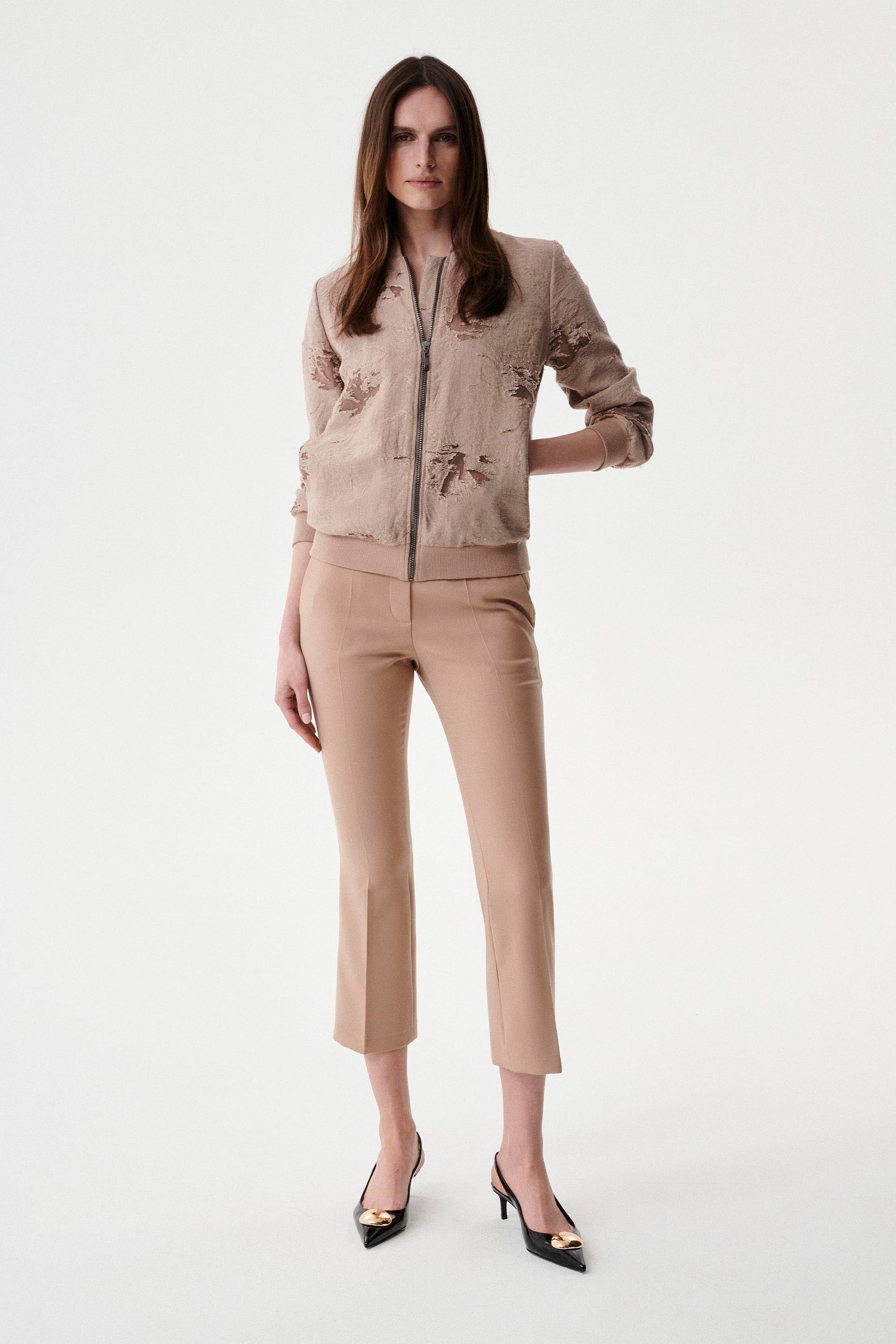 Eleganckie i wygodne jednocześnie spodnie przed kostkę, są doskonałym wyborem na każdą okazję. Wykonane z elastycznej tkaniny, doskonale dopasowują się do sylwetki, zapewniając komfort noszenia przez cały dzień. Delikatnie rozkloszowana dołem nogawka odkrywa kostkę, co dodaje lekkości sylwetce. Połącz z żakietem PARI w kolorze granatowym.