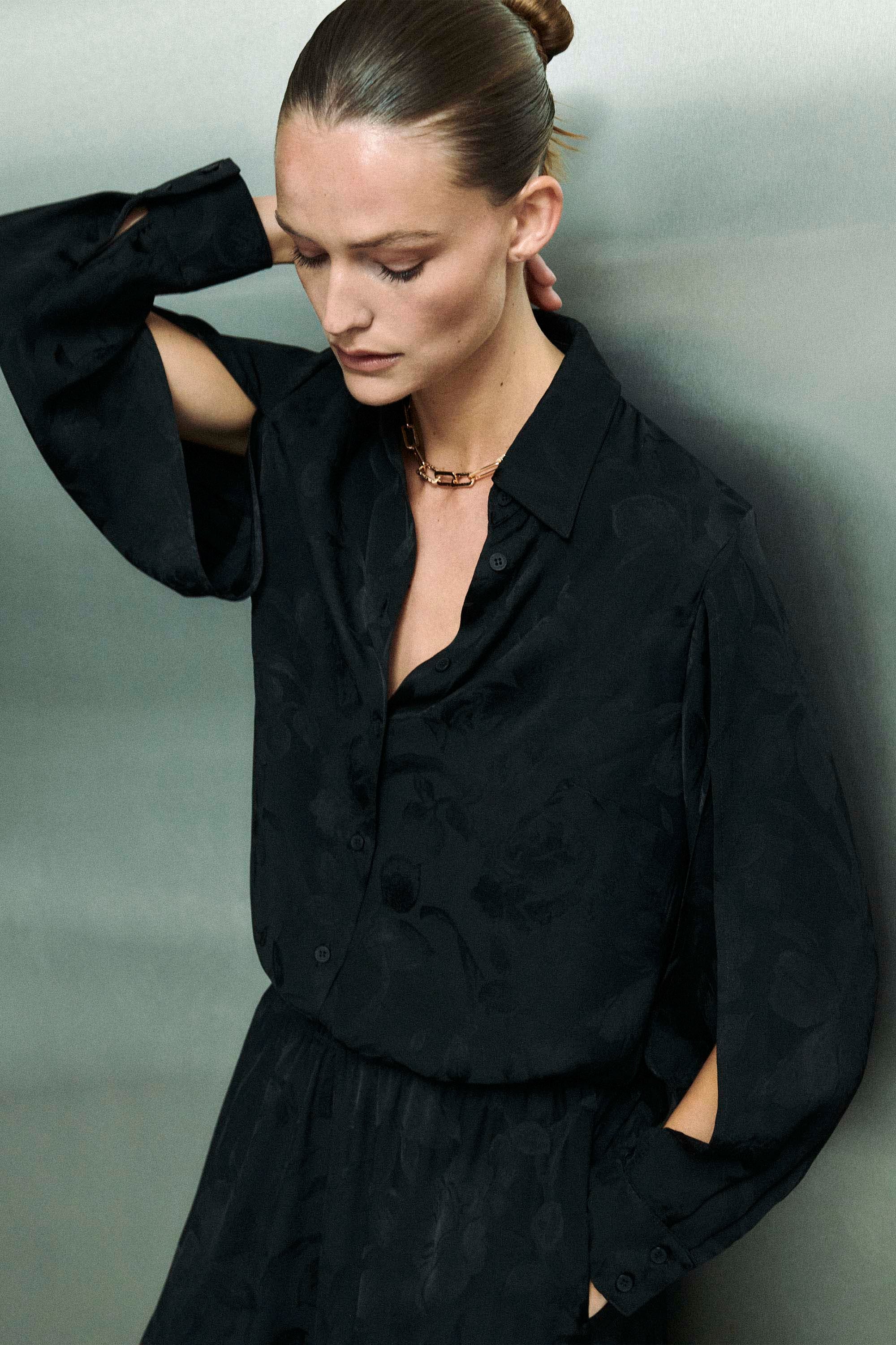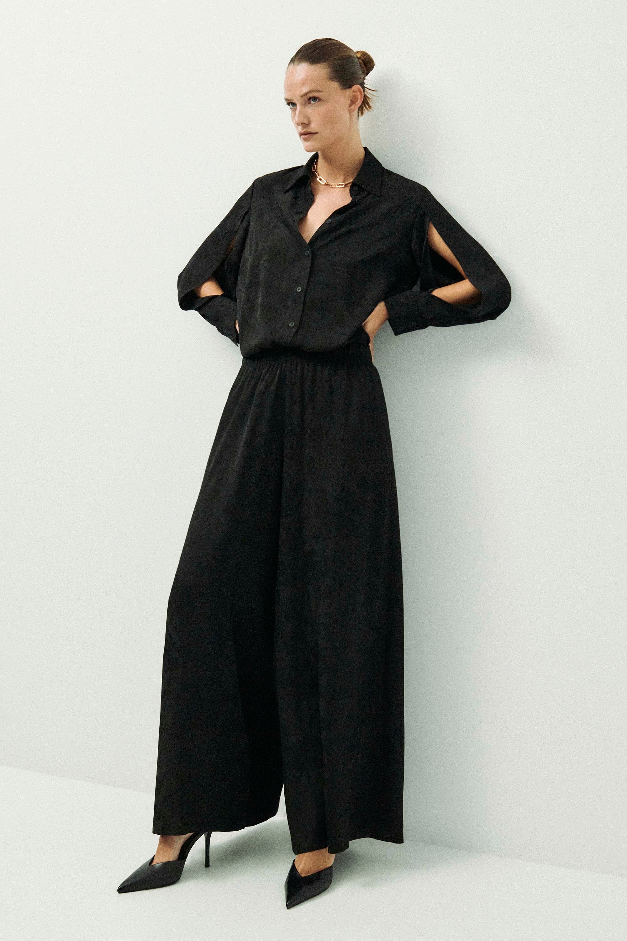 Szerokie spodnie z żakardowej wiskozy w kwiaty to idealna propozycja dla kobiet, które szukają wygodnych, a jednocześnie eleganckich modeli. Spodnie z gumą w pasie doskonale dopasowują się do sylwetki i są bardzo komfortowe w noszeniu. Rozkloszowana nogawka nadaje im lekkości i nowoczesnego stylu, a żakardowy wzór w kwiaty sprawia, że prezentują się wyjątkowo efektownie. Model posiada praktyczne kieszenie i świetnie łączy się zarówno z prostymi topami, jak i z koszulą z tego samego kompletu CHLOE– koszulą z pęknięciem na rękawie. To doskonały wybór na co dzień czy na eleganckie wyjścia. Stwórz efektowny total look i połącz spodnie z koszulą CHLOE o pękniętych rękawach. Do całości dodaj sandałki na obcasie lub eleganckie klapki. To idealna stylizacja na Sylwestra, rodzinne spotkania czy przyjęcia, która prezentuje się luksusowo i modnie. Na co dzień połącz je z luźną koszulą KIMI lub sweterkiem GOETHE. Do całości dodaj biżuterię w złotym odcieniu i mokasyny.