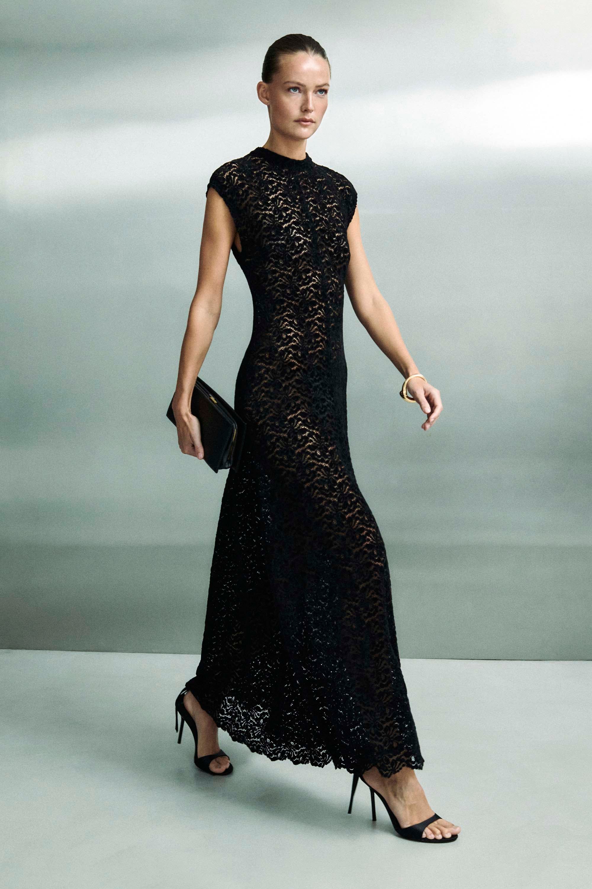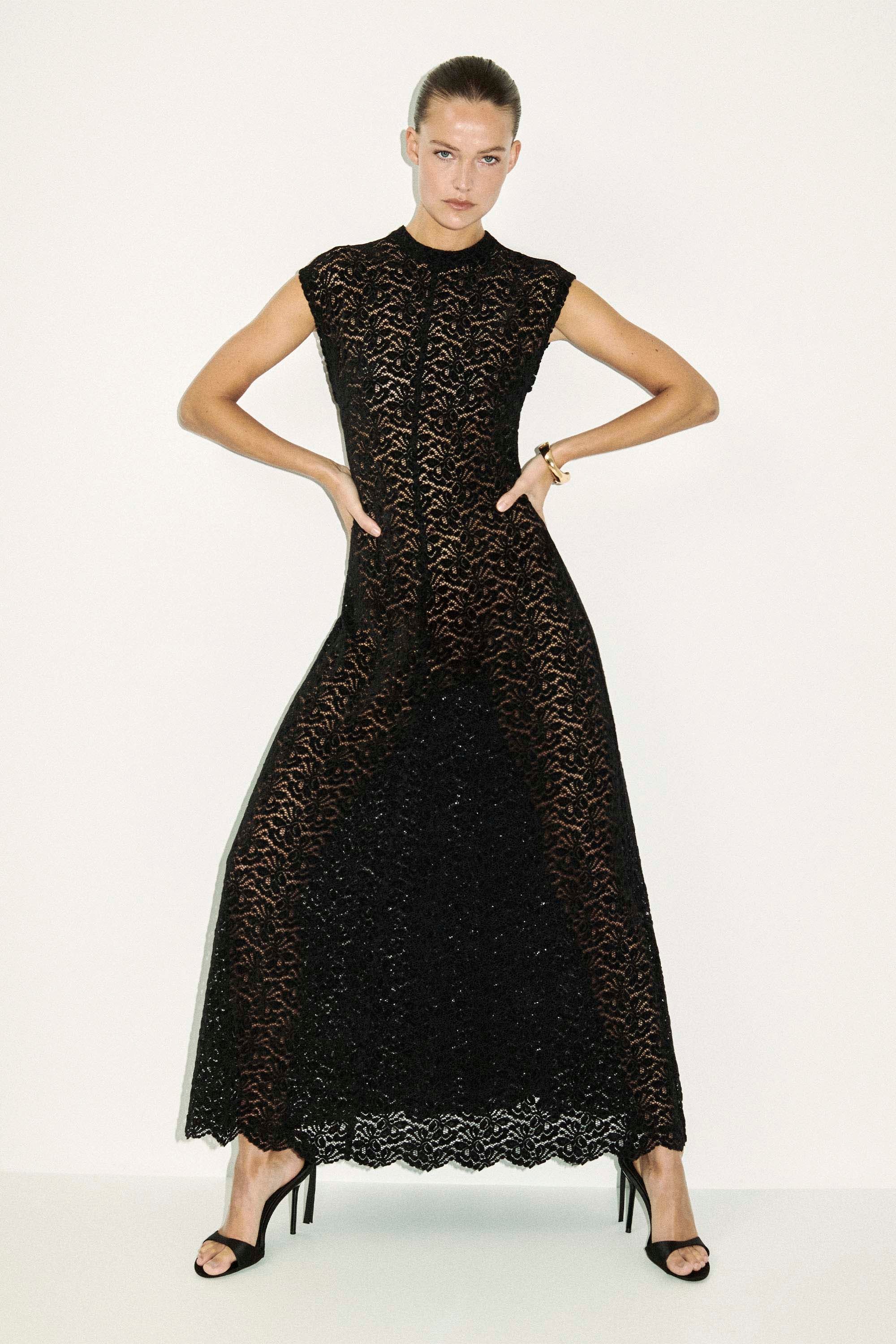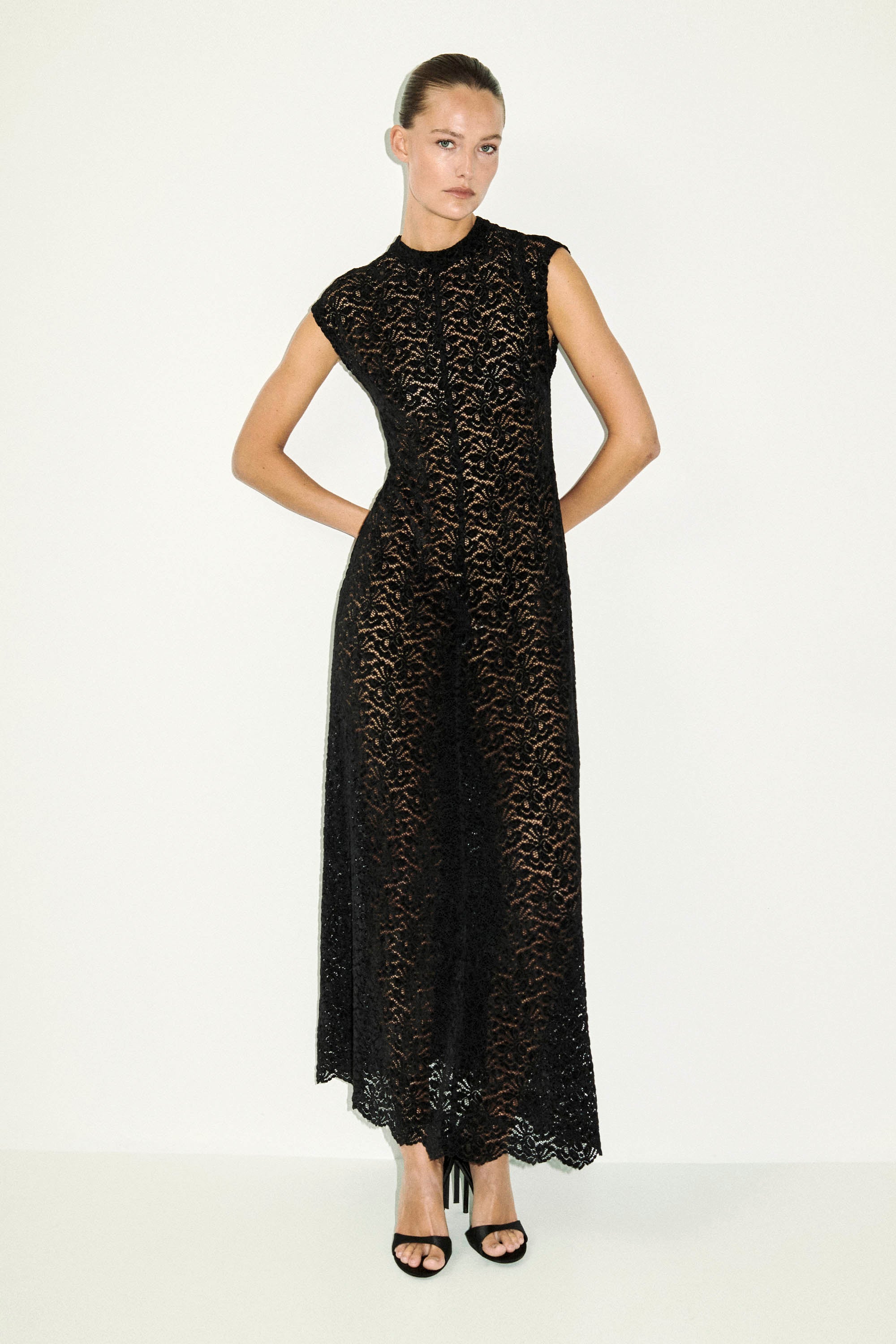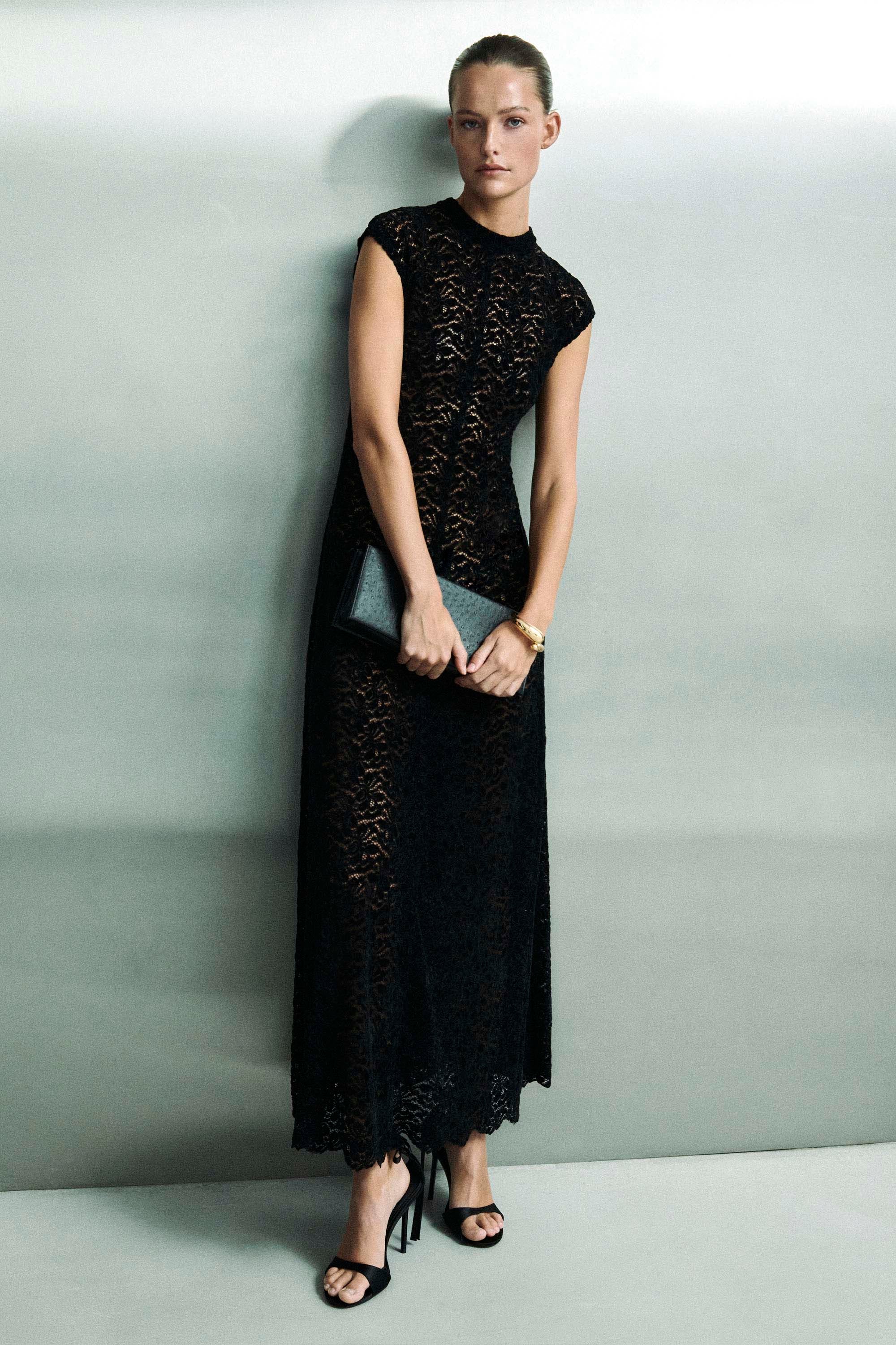 Elegancka sukienka VOILA z elastycznej koronki to idealny wybór na sylwestra, wieczorne wyjście albo elegancką imprezę. Ta piękna i niezwykle kobieca sukienka ma dekolt blisko szyi w formie małej stójki, lekko przedłużone ramię i zaszewki w talii. Wszystko razem optycznie modeluje i wyszczupla sylwetkę. Sukienka została uszyta z elastycznej, lekko przezroczystej koronki z aksamitnymi delikatnymi kwiatami, które tworzą efekt trójwymiarowej struktury. Sukienkę VOILA można nosić samą lub z dołączoną do sukienki wygodną krótką czarną halką uszytą z dzianiny bawełnianej z elastanem (modelka na zdjęciu ma sukienkę bez podszewki). Ozdobne, ręczne wycinane wykończenie dołu sukienki sprawia, że prezentuje się ona wyjątkowo elegancko i przyciąga wzrok przy każdym ruchu. To kreacja, która łączy zmysłowość, komfort i efekt glamour. Na Sylwestra załóż do niej szpilki w kolorze czerni lub srebra, kopertówkę z brokatowym akcentem i długie kolczyki. Na eleganckie party załóż do niej zamszowe botki na obcasie, marynarkę oversize lub ramoneskę ze skóry dla przełamania stylu i prostą biżuterię w złocie. Romantyczny wieczór w sukience VOILA to czarne sandałki na obcasie, subtelna biżuteria z pereł i aksamitna opaska do włosów.