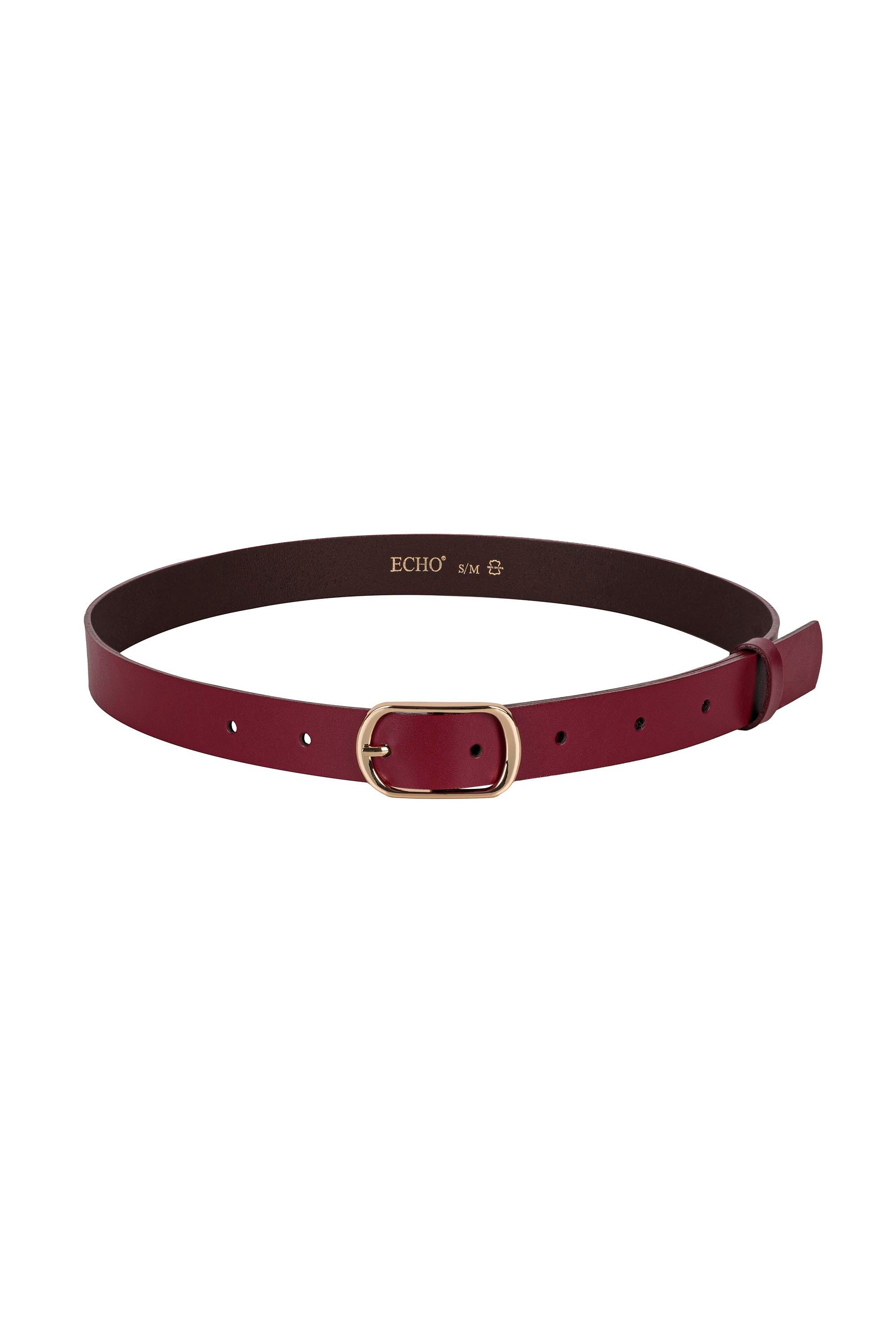 Bordowy pasek ze skóry z klamrą w kolorze złotym.