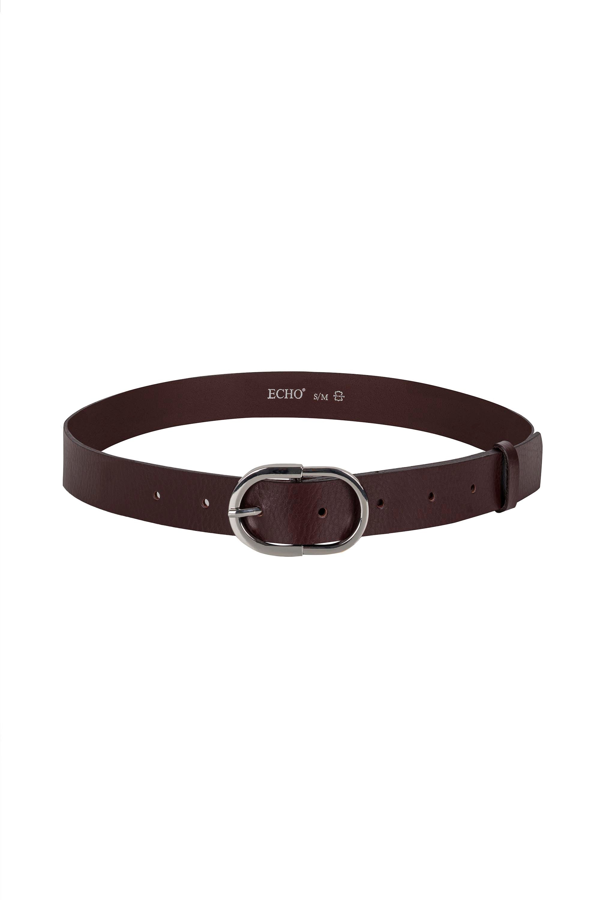 Brązowy pasek strukturalny z klamrą w kolorze srebrnym.