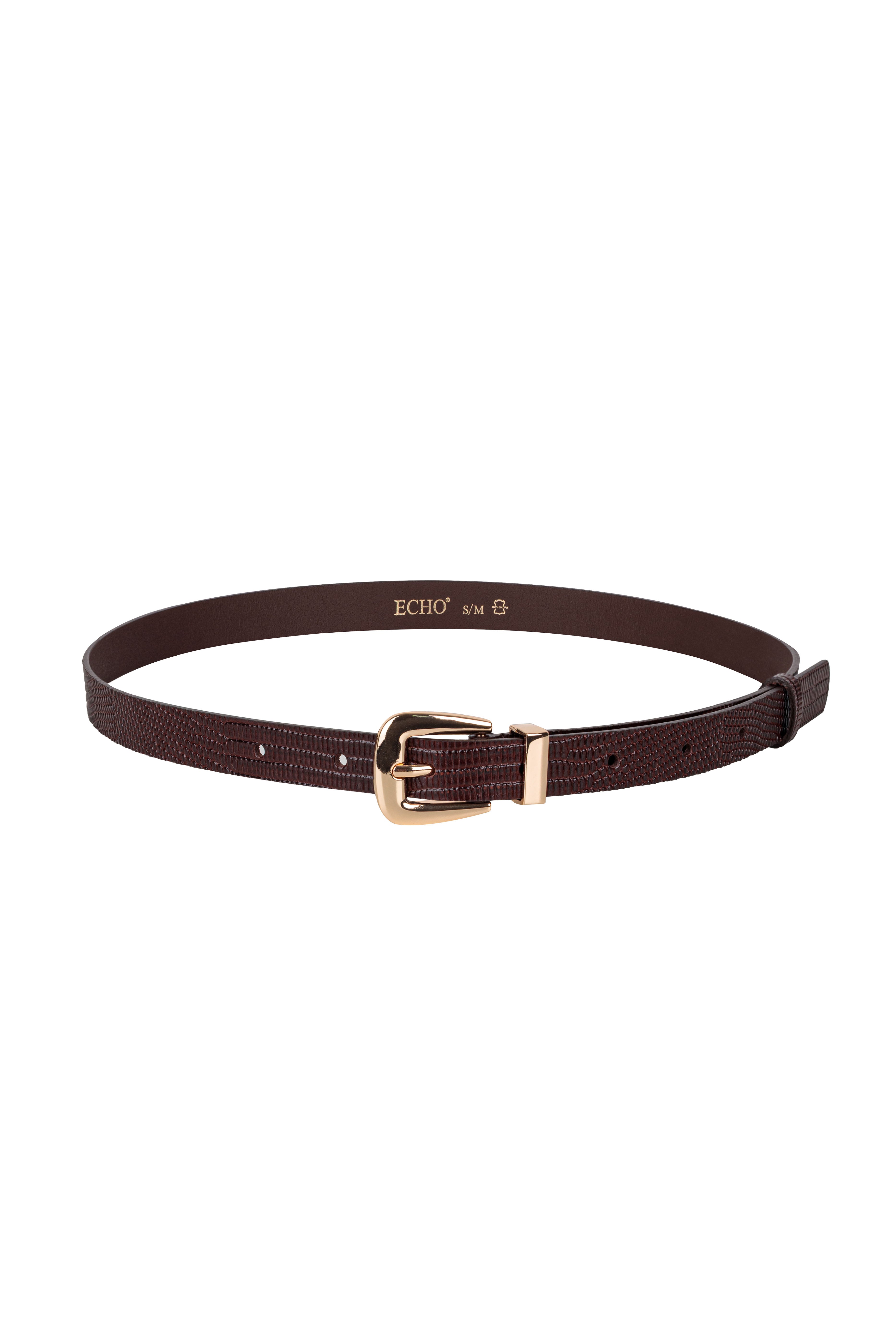 Pasek ze skóry z klamrą w kolorze złotym.