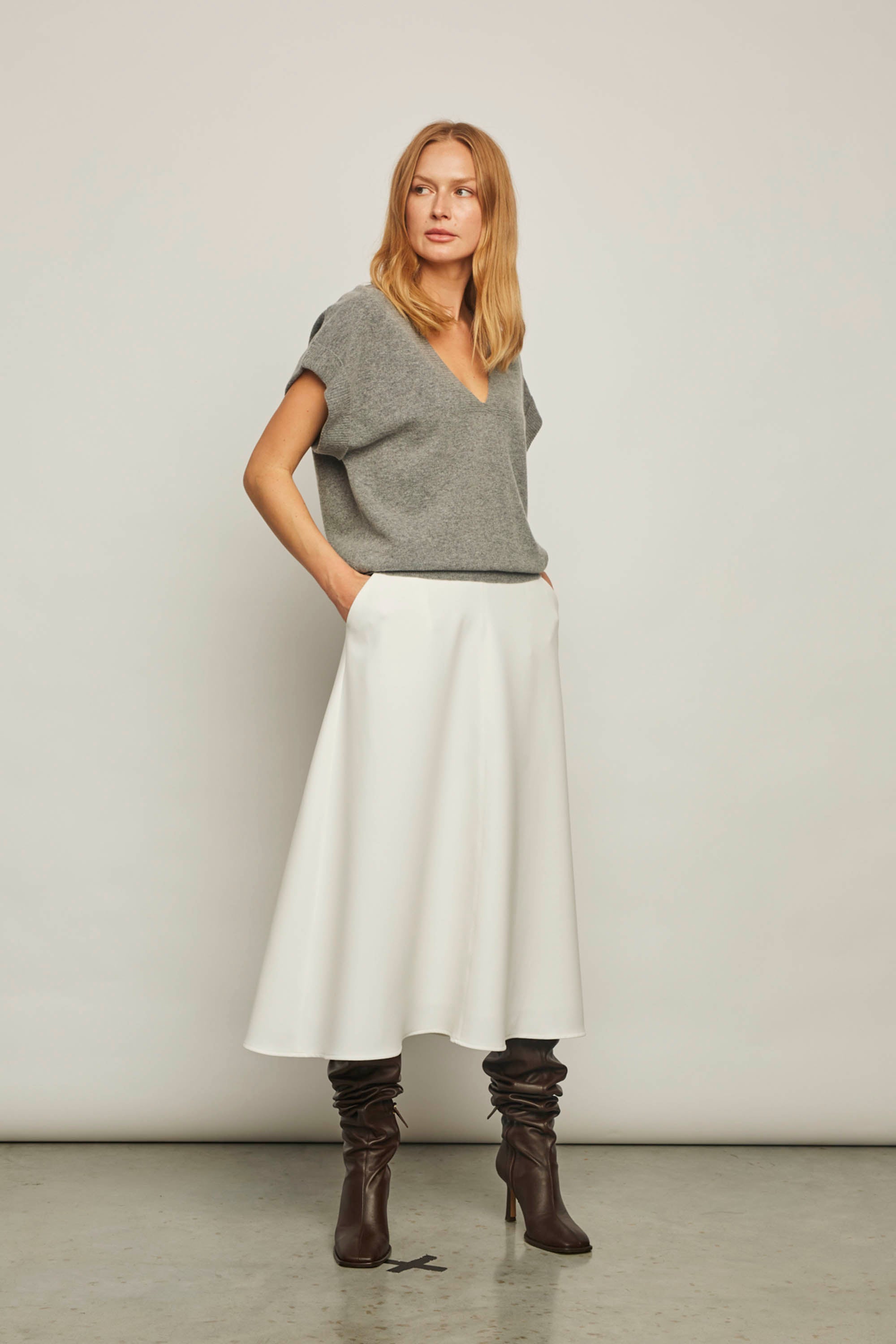 Rozkloszowana, elegancka spódnica Isidora to model, który można założyć do butów na obcasie, jak i do płaskich na grubszej podeszwie. Spódnica pięknie się układa podczas chodzenia oraz doskonale dopasowuje do każdej sylwetki, gdyż posiada mocno rozkloszowany dół. W przodzie zapinana jest ma zamek, a na bokach, w szwie ma praktyczne kieszenie. Tą uniwersalną spódnicę można połączyć w wersji eleganckiej, z koszulą lub dopasowanym cienkim swetrem. W bardziej casual'owym stylu można założyć do niej klasyczną bluzę dresową i sportowe buty. Isidora stanowi również bazę do świątecznych stylizacji, gdy zestawimy ją z elegancką bluzką z wiązaniem pod szyją, minimalistyczną biżuterią i sandałkami na obcasie. Spódnica posiada szlufki, więc można do niej założyć cienki skórzany pasek.