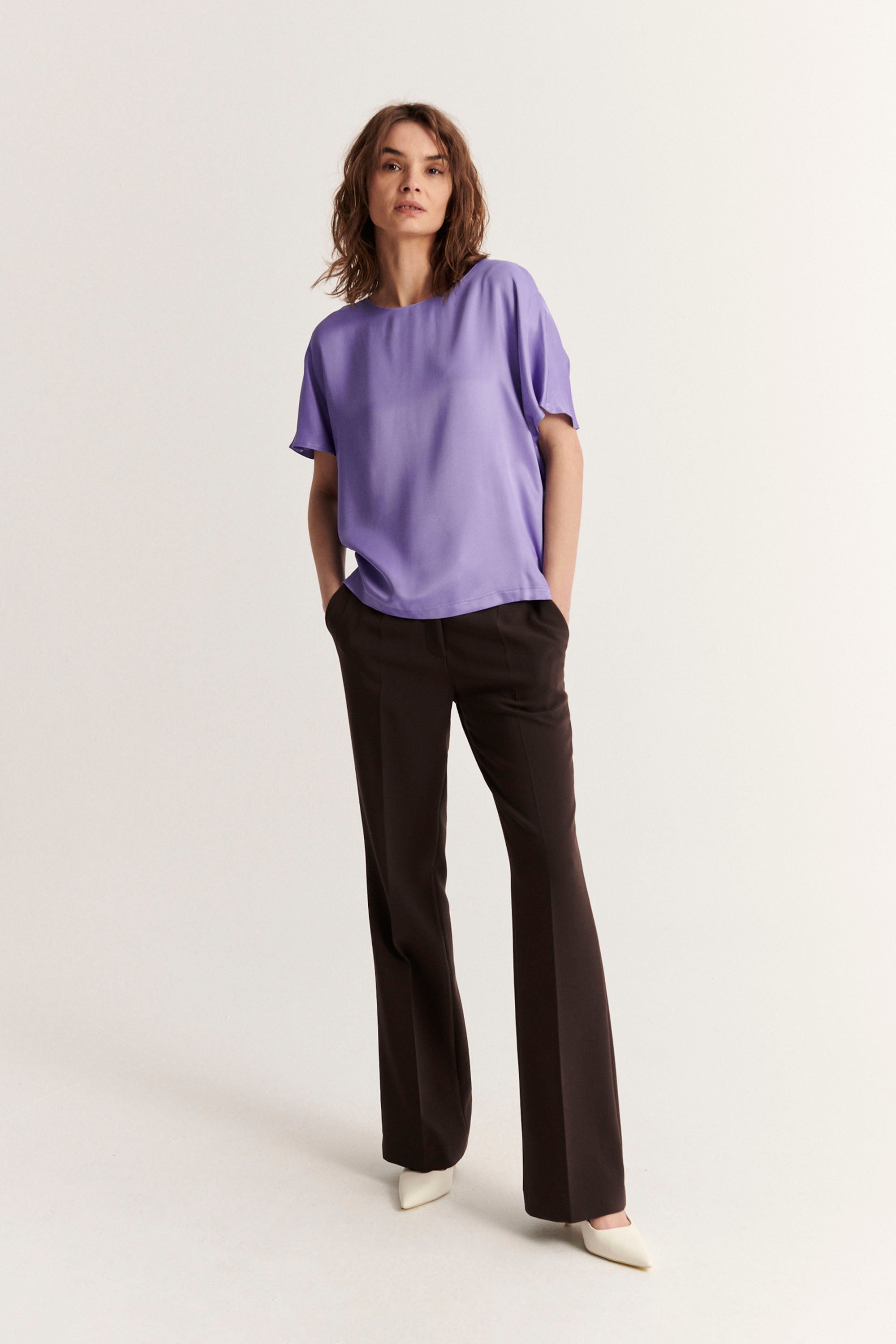 Eleganckie spodnie z kantką o klasycznym stanie. Spodnie posiadają dwie kieszenie, pas zapinany na zamek i guzik. Ich atutem jest rozkloszowana nogawka - dzwon.