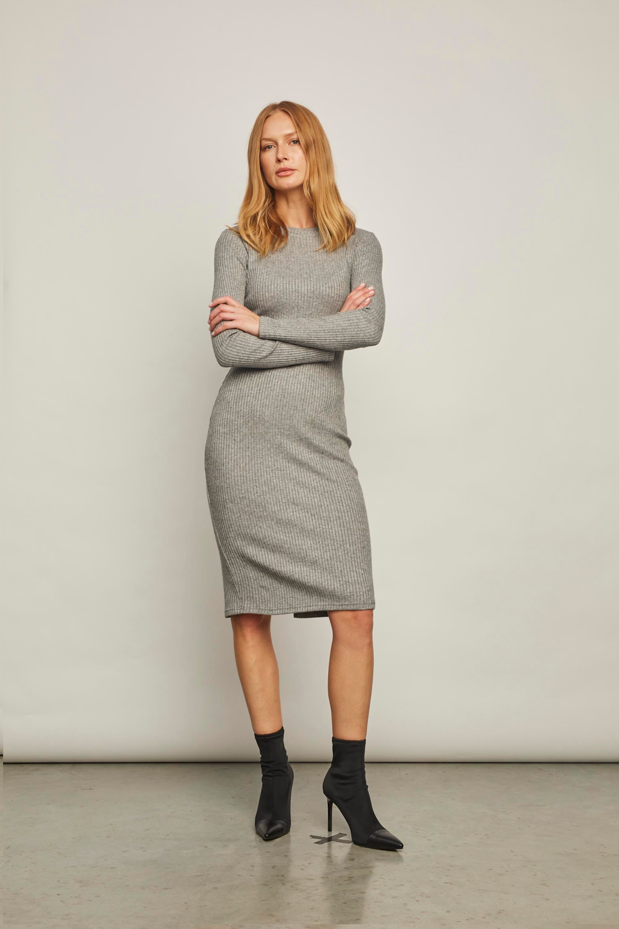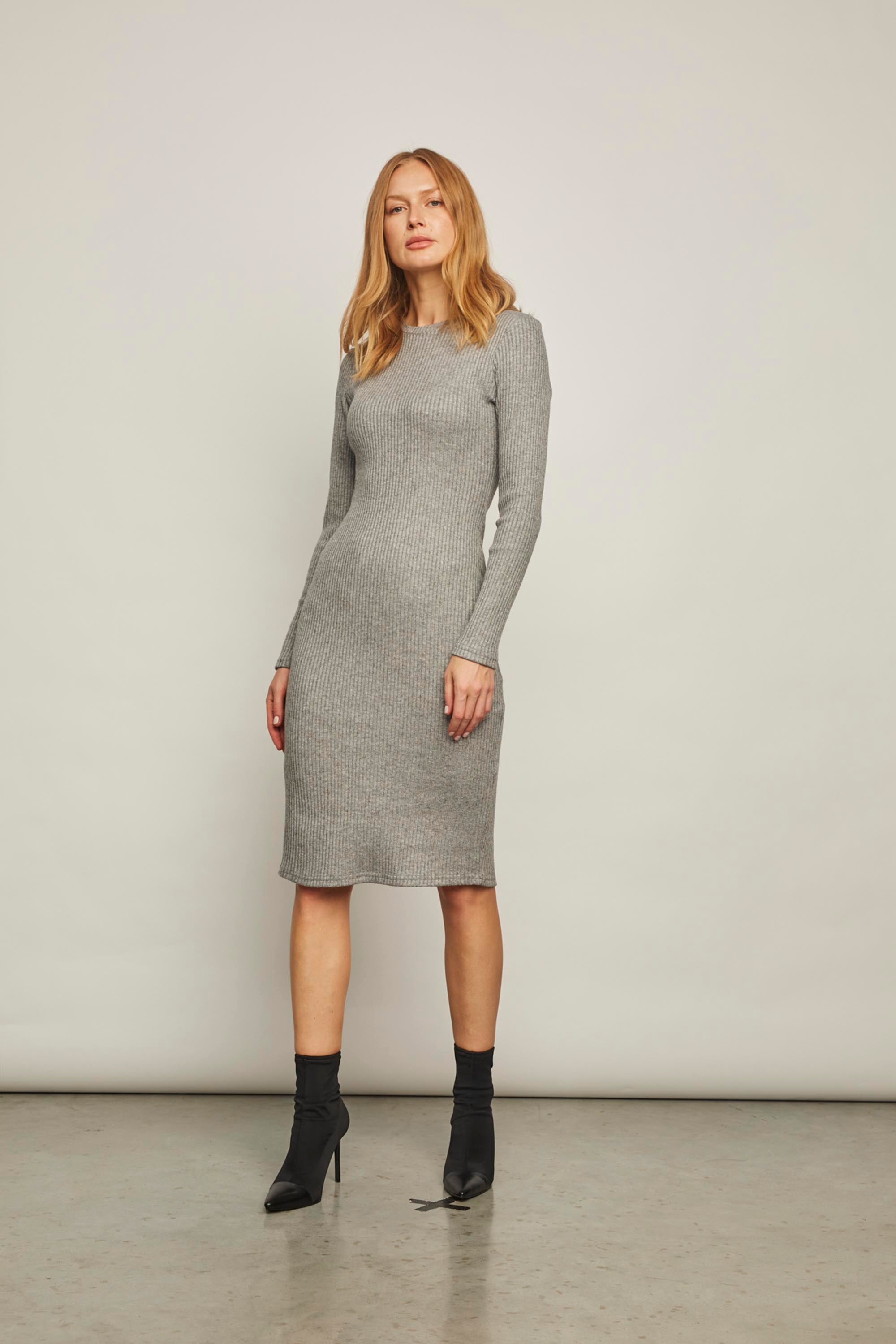 Sukienka szara- modelka ma 177 cm wzrostu i ma na sobie sukienkę w rozmiarze 38.
