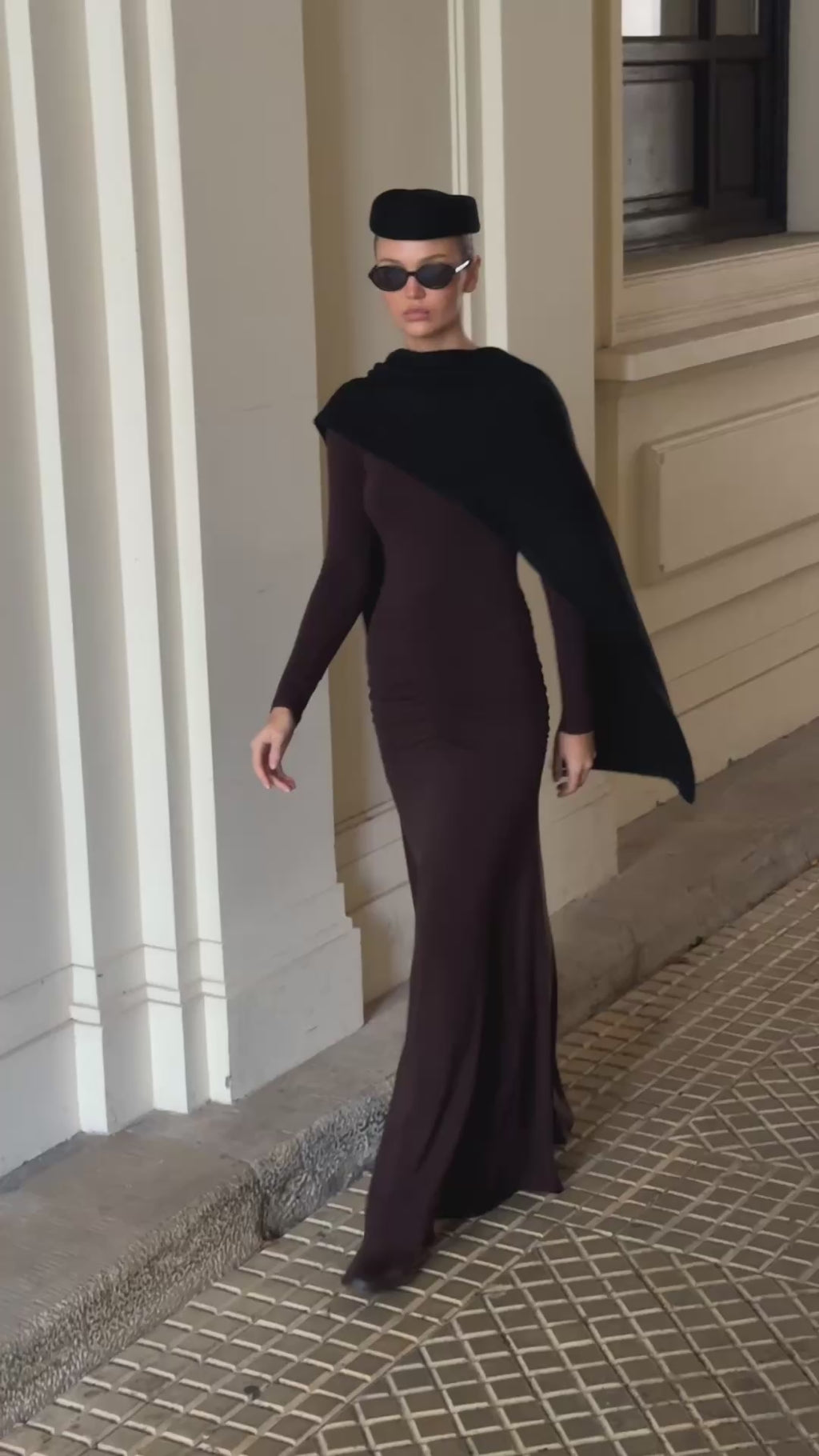 Sukienka CARLA maxi z dzianiny z włóknem Tencel i wełną, to elegancja w najczystszej formie. Sukienka została uszyta z cienkiej, lekko przezroczystej dzianiny z dodatkiem naturalnej wełny, z dzianiny miękkiej, oddychającej i delikatnie otulającej sylwetkę. Fason pięknie układa się na ciele, zapewniając swobodę ruchów, a jednocześnie subtelnie podkreśla kobiecą figurę.Rozkloszowany dół nadaje sukience lekkości i płynnego ruchu przy każdym kroku, a marszczenia na wysokości brzucha i bioder optycznie modelują sylwetkę i dyskretnie maskują drobne niedoskonałości. Góra sukienki podszyta jest drugą warstwą dzianiny, aby zapewnić komfort noszenia, natomiast rękawy i dół spódnicy są lekko przezroczyste. Długi rękaw i klasyczny, okrągły dekolt dopełniają całości, tworząc elegancki i ponadczasowy fason, który sprawdzi się zarówno na co dzień, jak i przy bardziej formalnych okazjach. CARLA to sukienka, którą pokochasz za jej wszechstronność, na co dzień zestaw ją z botkami i marynarką na chłodniejsze dni, a w cieplejsze pory roku czy na bardziej oficjalne okazje noś solo, z delikatną biżuterią i minimalistycznymi sandałami.